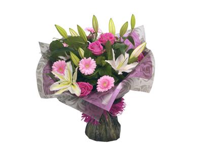 Delicate pink Roses, Lilies and mini Gerbera in an aquapack.